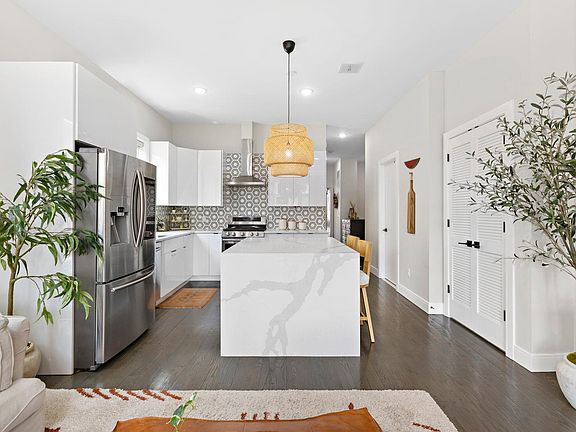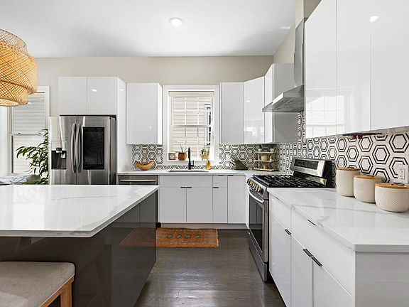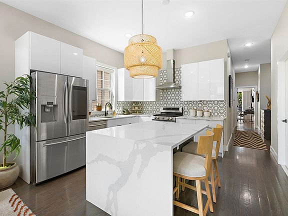 Experience the perfect blend of luxury and modern living in this high-end, 3-bedroom, 2.5-bath Jersey City Heights home. With 10-foot ceilings and oversized windows, natural sunlight floods the open floor plan, complemented by remote-controlled blinds. The chef's kitchen is a standout, boasting high gloss modern cabinetry, a stainless steel Premium Samsung Appliance package, and a stunning waterfall Quartz countertop island. The master bedroom suite features a private terrace, designer walk-in closet, and a luxurious bathroom with high-end fixtures and a multi-jet glass-enclosed shower. Additional highlights include a lower level family room/den with a wet bar, and a private yard perfect for outdoor entertaining. Enjoy in-home laundry, hardwood floors, central A/C controlled by Nest, smart home technology, and indoor garage parking (NOT TANDEM). Conveniently located near shopping, highways, and transportation to NYC.