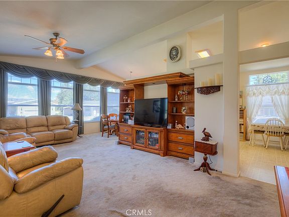 Level in from 2 car garage along a covered walkway and porch to front door. Driveway parking plus extra parking on the other side of the house. Outdoor gardens and living areas surround the house. Minimum traffic on this cul de sac. The front is a wall of floor to ceiling windows with custom widow coverings. An oversized eat-in kitchen opens to a formal dining area. The high ceilings and many windows create a spacious living area filled with light. This original owner has taken great care of this home. Park approval required for this Senior Community,