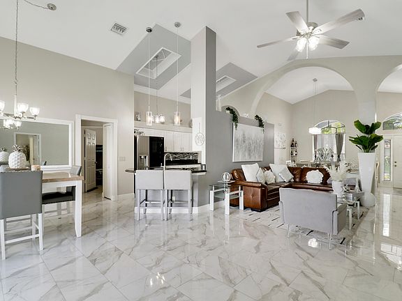 Spectacular lakefront 4-bedroom home in sought after River Bridge. Upgrades include: 2024 ROOF, KITCHEN BACKSPLASH, APPLIANCES, PORCELAIN MARBLE STYLE FLOORS in living areas and laminate wood floors in all bedrooms. The tastefully remodeled second bathroom doubles as a cabana bath. Additional features include high ceilings a spacious SCREENED IN PATIO w/A LARGE INGROUND SPLASH POOL w/WATERFALL OVERLOOKING THE LAKE. Accordion shutters throughout and so much more.