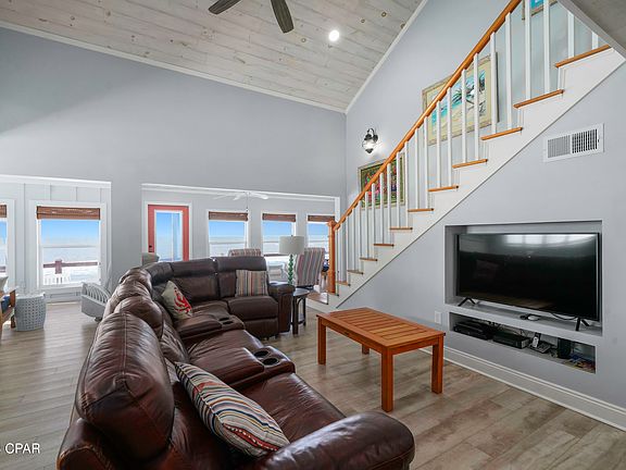 CURRENTLY UNDER CONTRACT, SELLER WILL CONSIDER BACKUP OFFERS. THIS SEASIDE RETREAT INCLUDES A RARE FIND OF 130 FEET OF GULF FRONT! This 4-bedroom, 3-1/2 bathroom is just steps away from the pristine, sugar-white sands of Cape San Blas. Designed with an open-concept layout, the home offers a seamless flow that's perfect for both relaxation and entertaining. The living room features elevated two-story plank ceilings, flooding the space with natural light from the wall of windows and creating an inviting atmosphere. The kitchen is light, bright, and spacious, with beautiful granite countertops, premium stainless-steel appliances, ample cabinetry, a beverage refrigerator, and complete with breakfast bar seating. Step outside onto the expansive deck to enjoy breathtaking views and the invigorating Gulf breeze. The first floor features a primary suite with an ensuite bath, direct access to the gulf view sitting area, and perfect for savoring your morning coffee while watching the sunrise. This level also includes a half bath and an additional guest bedroom with its own private ensuite. On the upper level, you'll discover a serene retreat featuring a king suite with its own private balcony, accompanied by an additional guest bedroom. When you step outside, the home offers a private outdoor shower with hot and cold water, perfect for rinsing off the sun, salt, and sand after a relaxing day at the beach. With panoramic views, direct beach access, and proximity to the 8-mile Walk/Bike Path, this home provides the perfect coastal escape. This home is conveniently located near the local shops, perfect for a bike ride or walk for fresh donuts or a sweet treat. Don't miss out on the opportunity to own a piece of paradise in one of Florida's most sought-after beach destinations. Explore the property virtually with the 3D tour and schedule your private showing today!