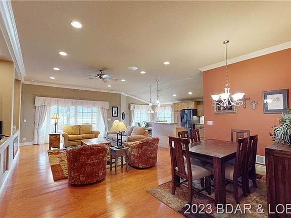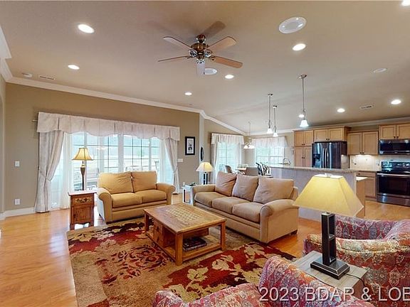 Now's your chance to live in the increasingly popular Osage National Subdivision, Missouri's only Arnold Palmer Signature Golf Course. This home overlooks 4 different golf course holes. There are many wonderful features in this home including large Great Room with 10' ceilings, engineered hardwood floors, granite kitchen tops, glazed cabinets, black stainless steel appliances, 2 built-in entertainment centers with granite tops in Great Room, crown molding, plantation blinds, tiled showers in both bathrooms, Trane HVAC with built-in dust collector and lifetime filter and 2 tankless water heaters. Enjoy the views, hanging out and entertaining from the spacious screened Lani. Oversized 2.5 garage with built-in shelving and work bench. Home is nestled among cedar trees and offers privacy from neighbors. Osage National is a golf community featuring 27 holes of golf, a beautiful resort style pool, Clubhouse and a fitness center. This isn't just a home, it's a lifestyle!