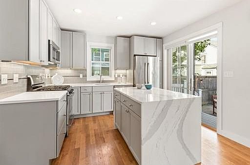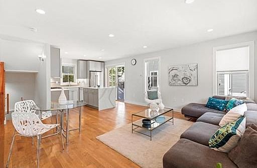 Tucked away from the street, just two blocks to Central square, this modern 3 bedroom single family style house, built from the ground up in 2015, feels very private and receives wonderful light from all sides - The main living level boasts an efficient space with a fresh and elegant kitchen appointed with grey cabinets, tiled backsplash, white Quartz Calacatta top and an added island for additional storage. Double doors opens to a quiet and fenced patio, perfect setting for outdoor dining or lounging. The 2nd floor hosts 2 bedrooms, - one very serene with a South facing deck, lovely views and cathedral ceilings - the other showcases transom windows, and a sizable sunny tiled bathroom. The walk-out lower level was thoughtfully designed for versatility with pocket doors, to close or disappear. Make it a 3rd bedroom suite with bathroom, a family/media room, a home office or guest quarter. Highly energy efficient house with spray foam insulation and all new systems 2015. Parking next door