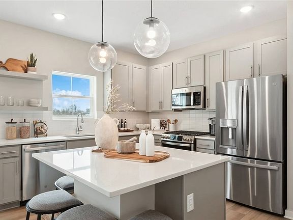 A spacious en suite off the foyer provides a private retreat for guests or multigenerational living. The chef-inspired kitchen features a center island, quartz countertops, and stainless steel appliances (including refrigerator) and opens to a spacious dining area and great room, perfect for entertaining.