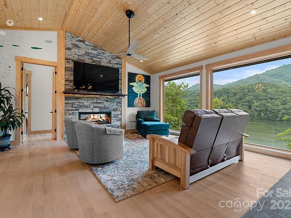 Nestled in the Great Smoky Mountains, Fontana Lake Estates is a premier gated lakefront community where nature & adventure thrive. This stunning approx. 3,791 sq ft, 5-bed, 3.5-bath mountain modern home blends rustic charm w/ modern design. Built for longevity, it features a poured concrete foundation, standing seam metal roof, & Hardie plank siding. Inside, find hardwood floors, cathedral ceilings, quartzite & leathered granite countertops, custom cabinetry, & a spacious butler’s pantry. The primary suite boasts a coffee bar, custom closet, & spa-like bath. A bonus flex space is perfect for a studio. An approx. 374 sq ft workshop is accessible from the lower level exterior. A TimberTech deck offers breathtaking lake & mountain views, w/ a gently sloped path to a private dock w/ water & power. Community amenities include paved roads, a boat launch, scenic trails, & more. Nearby, Cherokee, Bryson City & the Nantahala Outdoor Center offer rafting, hiking, & dining. Adventure awaits!