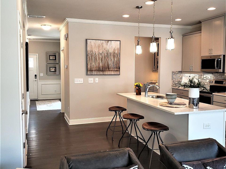 END UNIT- Floorplan called 'Deerwood.' Three Stories. Cozy home with hardwoods on main floor and stairs. Beautiful granite countertops with island and pendent lighting above. Breakfast area overlooking the fireside family room with coffered ceilings. Separate dining room with butler pantry leading into the kitchen. Inviting master spa with tile floors, relaxing Garden Tub, separate shower, vanity/dual sinks, and walk-in closet. Media room/optional office/bedroom on terrace level. Community offers clubhouse with swim and tennis. LOW HOA fee, covers water/sewer/trash.