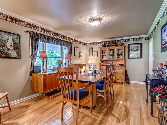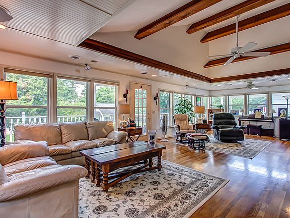 The spacious living room is wrapped in windows, allowing the outdoors to become part of your decor. A large deck runs the length of the room, providing yet another location to sit and enjoy the park-like setting.