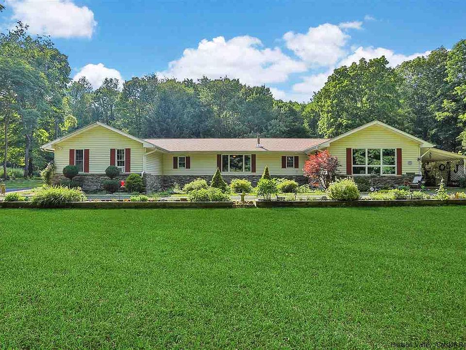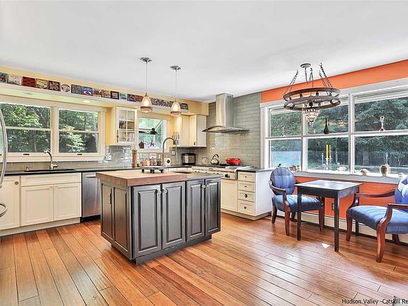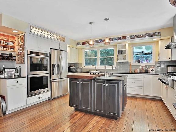 Nestled down a long gravel driveway and surrounded by mature trees, lush woods and gardens, this unbelievable rambling Ranch home is truly a retreat. If you are looking for a full-time residence with rental potential, room for an in-law, an artist studio, home office, or so much more, this gorgeous home checks all the boxes. This unique and charming property has a warmth to it that can only be described by stepping foot inside. The entrance leads into an open mud-room area with built in shelving and cabinets, sprawling open concept, drenched with natural light and generous space for family and friends, near and far. The completely renovated gourmet custom kitchen features beautiful granite counter-tops, custom cabinets, double oven, commercial gas stove and center island. The layout flows to a window area eat-in kitchen and open dining room with wood-ascent wall and gleaming wide-board hardwood floors, which walks out to the outdoor living space, ideal for dining al fresco, relaxation and entertaining. The open living room is spacious and inviting with a large window and artistic details. The north side of the home also features two spacious bedrooms and a full bathroom. The south side of the home enters the breathtaking in-law suite, with open kitchen and beautiful living room with built-in bookcases, a spacious bedroom, full bathroom, and unbelievable sun-room with wood ceilings. The in-law suite also has a quaint private exterior patio. The lower level of the home is setup for guests with summer kitchen and full bathroom, two additional bedrooms, and family/media room. The exterior features a beautiful in-ground pool with outdoor dining area, hot-tub area and fire-pit. The rear yard offers total seclusion with a fenced in garden area, shed and green spaces for outdoor enjoyment. Minutes from New Paltz, Mohonk Preserve, the rail trail, Walkway Over the Hudson, restaurants, shops, breweries, vineyard and so much more. This property is truly everything you desire for your upstate New York compound!