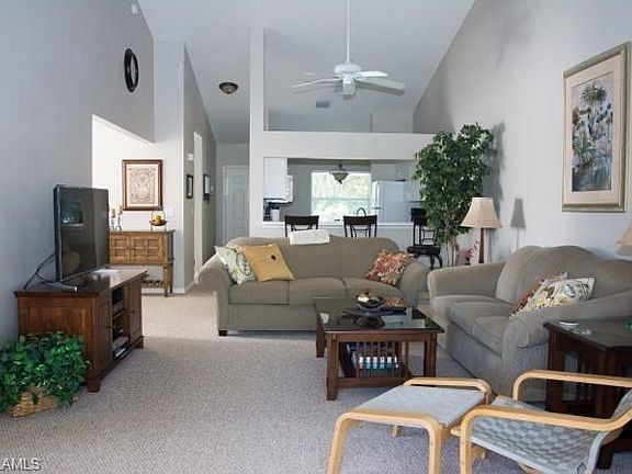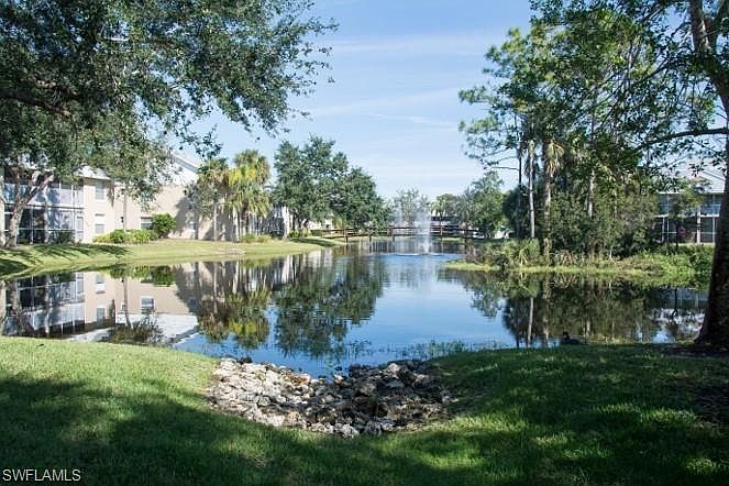 This meticulously maintained 2nd (top) floor end unit has vaulted ceilings and windows on 3 sides, filling the unit with loads of bright Florida sunshine. Coupled with breathtaking island and fountain views and its great location in the quiet community of Pebble Shores, being here will leave you feeling like you are truly in paradise. Centrally located in Naples, Pebble Shores is a quiet community with a new pool in 2017, new roofs in 2019, regular budgetary surpluses and substantial funds in the current reserve. The HOA dues have also been frozen (no increases) for 2 years. This 2 bed plus den and 2 full bath unit has newer appliances and has been recently painted. Don't miss this rare opportunity to own an affordable condo just minutes from the beach, restaurants, and shopping!