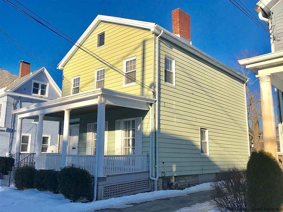 Kingston Uptown Stockade district; walk to restaurants, pubs, shopping, supermarket, hardware/home store, museums, houses of worship, banks, bakeries etc. in the vibrant, renewed "Brooklyn-on-Hudson". This house was converted to a professional office decades ago and is now calling out to be renewed to a home once more. Two walls were built to create a reception area, which when removed will return the space to living and dining rooms, each with a mantel and fireplace box. (neither is functional, yet each looks lovely and might house a ventless gas firebox) A new kitchen can easily be created by combining a rear entry room and the adjacent office, by removing one small wall..allowing the next owners to create their perfect culinary vision. Under the wall to wall carpeting there appears to be hardwood (fir) flooring. The upstairs is accessed by a lovely staircase with period, intact railing and spindles. The second level contains 3 rooms (formerly bedrooms) plus a full bath with tub and shower...likely from the early to mid 20th century (the space is ample and has a proper window). The floors on this level are medium width hard pine with a lovely aged patina in the bedrooms and fir in the upstairs hallway. There is a full attic, with floor boards, accessed by a somewhat steep staircase, as was the custom of the era.