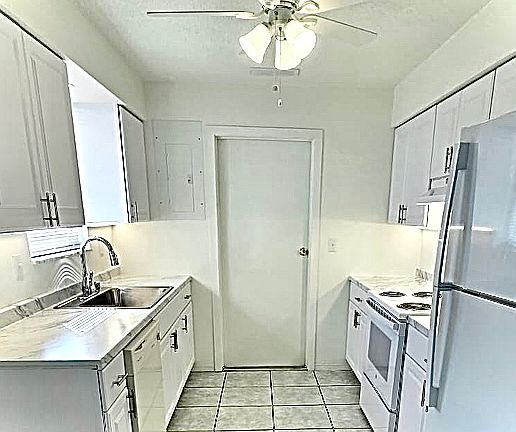 Renovation completed - this home boasts stunning upgrades throughout. The kitchen is a chef's dream, flooded with natural light and adorned with elegant white cabinetry and all appliances (stove, refrigerator, dishwasher, washer/dryer). Both bathrooms are stylishly remodeled. Gorgeous tile flooring throughout. The sunny living room offers an open layout. Large bedrooms. All rooms are bright, freshly painted in alabaster white - ceiling fans. Enjoy the best of Ormond Beach: beach and river access, parks, restaurants, shopping and schools. Tenant to provide window air conditioners - no central air conditioning.