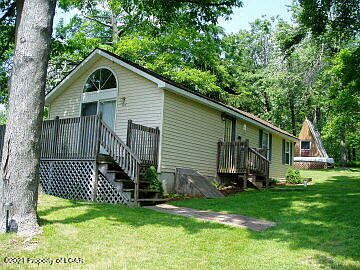 Desirable private community. with lake rights, private beach, club house & all community activities. Enjoy the tranquiity & beauty of the lake view from your front deck, or you're just steps away from your floating dock. Included, Canoe and Row Boat - Chalet with electricity - all appliances, most of the furniture - 2 additonal adjoining lots for lots of parking, outdoor fun and expansion.