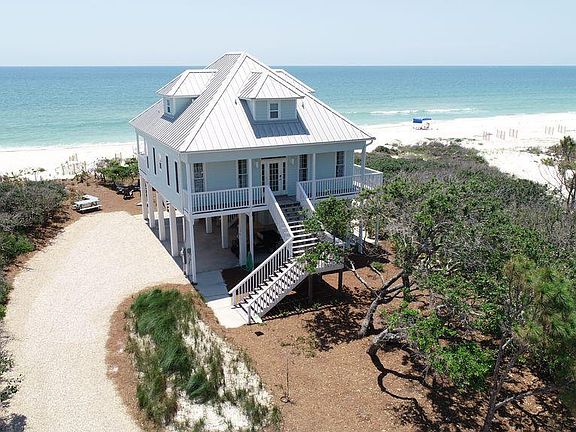Experience coastal elegance at its finest in this exquisite beachfront residence located in the prestigious St. George Plantation. Nestled along the pristine shores of St. George Island, this fully renovated Gulf front home is a true sanctuary of style, comfort, and refined living. Step inside to a beautifully reimagined interior, completely updated in 2018 with high-end finishes and an effortless coastal aesthetic. The heart of the home is a designer kitchen that will impress even the most discerning chef—featuring striking granite countertops, a farmhouse sink, custom cabinetry, and a suite of premium stainless-steel appliances, including a professional 48” double oven range with gas burners. Open concept living and dining spaces flow seamlessly onto a spacious beachfront deck and a serene, screened porch, offering panoramic views of the Gulf and a perfect setting for indoor-outdoor living. Luxurious bathrooms are adorned with Carrara marble showers and modern lighting, while stylish furnishings throughout the home are included, making this a turnkey opportunity for the luxury buyer. Located within the exclusive gated community of St. George Plantation, residents enjoy 24-hour security and an exceptional array of amenities including tennis and pickleball courts, scenic nature trails, a private airstrip, fitness center, and a sparkling community pool. Whether you're seeking a private retreat or a high-end investment property, 1920 Coral Reef Road delivers an unparalleled blend of sophistication, comfort, and the ultimate beachfront lifestyle. New Roof 2/2025. .5% New Buyer Fee paid to SGPOA.