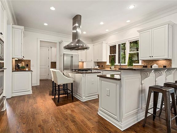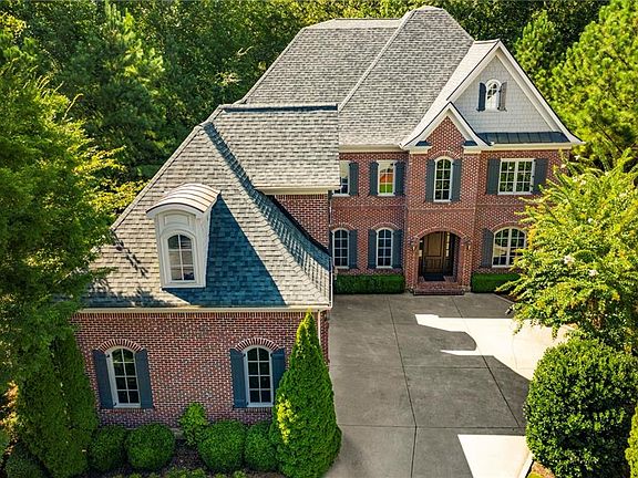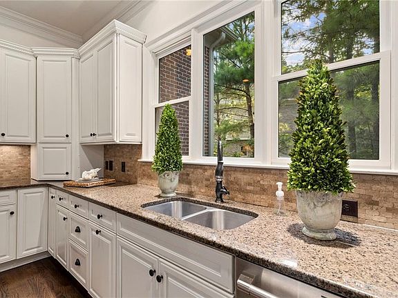 The warm brick walls and portico arching over the large stained wood front door create a welcoming entrance to the 4 sided brick executive estate that you have been waiting for! Nestled in a quiet cul de sac that backs to the beauty of the Chattahoochee River National Recreation Area, privacy abounds in this River's Call oasis. The warm hardwood floors, finely crafted custom millwork throughout, soaring ceilings, and stunning natural light will be the first things to catch your eye as you enter the foyer. Flanked by large formal living and dining rooms that yield to an enormous gourmet kitchen featuring granite counters, light and bright cabinets, gas cooktop island, stand alone stainless steel range hood and appliances, separate prep sink, and butlers pantry. You'll be looking for reasons to entertain! The kitchen opens to a large eat-in dining area and den featuring gorgeous coffered ceilings with recessed lighting, a wood-burning fireplace with custom built-in surround, and the bright warm glow of natural light from a bay of oversized floor-to-ceiling windows overlooking the expansive back deck running the width of the house. Upstairs you'll relax in the primary suite with large windows highlighting the views overlooking the serene forests adjacent to the Chattahoochee River. The primary bedroom is serviced by dual bathrooms with separate large walk in closets including a nearly 1000 square foot space ideal for storage and crafting. All baths feature glass and tile enclosed showers, granite counters, and stained wood cabinetry with aged bronze fixtures and accessories.