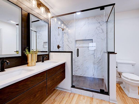 Primary Bathroom Suite Features a Custom Floating Vanity and Large Shower.