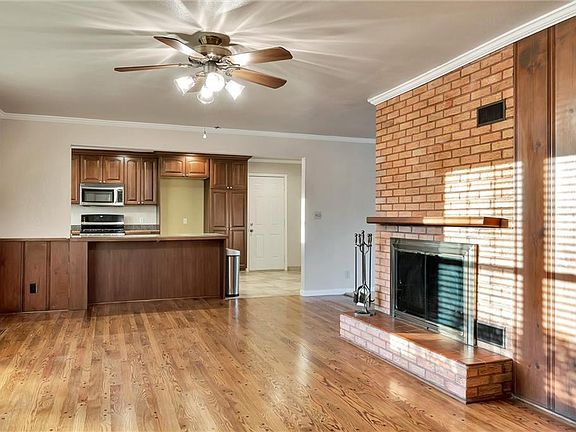Very nice brick home with 3 bedrooms and 3 baths. Kitchen features beautiful cherry wood cabinets, stainless appliances and granite counter tops. There are 3 eating areas; breakfast bar, breakfast nook and formal dining area. The formal dining area opens to the kitchen and has gorgeous wood flooring, a wood burning fireplace and large windows with wood blinds. The living area is a huge carpeted room that leads to the large outdoor deck. All 3 bedrooms are over-sized, with 2 on one end of home that share a large bath and a secluded master with a jetted tub and a large walk-in closet. There is a third bath just off the mud room with a shower. Indoor laundry room and amazing storage throughout. There is an attached garage and also a detached garage. Backyard has a privacy fence on concrete curbing, shed, and large wooden deck. Home has an inground storm shelter, rain gutters and an under ground sprinkler system in the front yard. Great curb appeal and concrete circle drive.