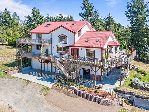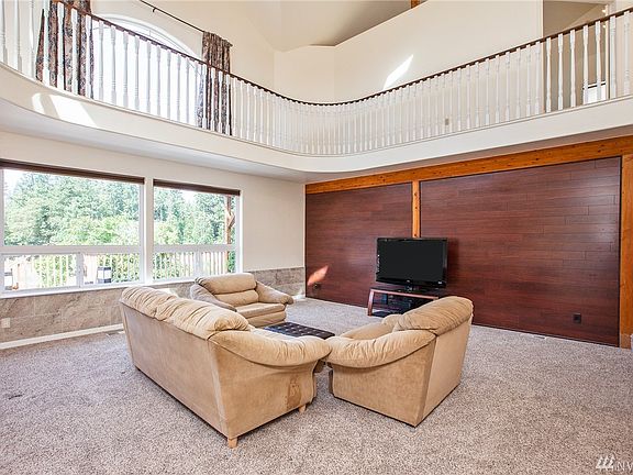 Stunning, custom home w/ 4800+sqft! 4 total rooms & 3.25 bath. Open concept living w/ 25' ceilings, a grand staircase to 2nd level master suite w/ private deck + NEW spa-like bath. All baths remodeled! Enjoy large, open kitchen w/ banquette + formal dining room with mt. views. Extra bonus: Den/office, massive garage w/ indoor RV space, workshop, full bath + rm for possible MIL. Iron wood decking + metal roof & NEW Trane HVAC system!Close to Silverdale & Poulsbo, only 2 mins to BV Marina!