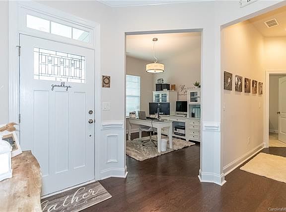 Stunning 2 bedroom 2.5 bath ranch with bonus room in desirable Bonterra. Upon entering this gorgeous home you will find a foyer with heavy wainscoting and crown molding throughout, an office/den, 2.5 bathrooms, bonus room (that could easily be converted to a bedroom) an amazing kitchen and a gorgeous Master Suite. The large open kitchen features an oversized island with linen colored cabinets, gourmet SS gas appliances, upgraded granite countertops, subway tile backsplash, walk in pantry and a beautiful built in drop zone just off the kitchen. The family room boasts a direct vent fireplace for cozy nights in, is open to the dining area, and leads to the covered back porch with a large privacy fenced yard for relaxing and entertaining. The enormous Master Suite features tray ceilings, quad windows for natural light, an oversized walk in closet with built-ins fit for royalty, granite double sink vanity, large shower with tile surround, and access to the laundry room.