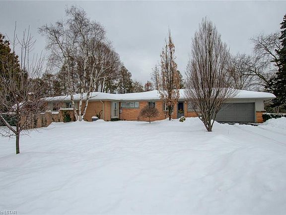 A Home for All Seasons! Situated on over half acre of breathtaking manicured privacy in North London's desirable upscale neighbourhood of NORTHCREST is this sprawling & effortlessly elegant 4 bedroom, 4 bath one floor home with double attached garage plus loads of parking on front and side driveways. Access the front entry by lovely flagstone walk covered by shady pergola; the unique interior layout features an open plan feel while maintaining the integrity of separate living zones accented by neutral wall colours, hardwood floors and crown moulding; an abundance of large windows capture great views from all sides of the home while flooding the home with maximum natural light; the efficient kitchen layout has been designed with serious chefs in mind with timeless custom cabinets, granite counters, quality gas stove, 'Fisher PayKel' fridge, spacious apron front stainless steel sink & drawer dishwasher; huge family sized dining room opens to living room with fireplace; TV room; luxurious master bedroom suite in its own wing boasts newer floor to ceiling picture window, fireplace, dressing area with plenty of closet space + 3pc ensuite; 3 additional bedrooms + 5pc family bath are situated in a separate wing of the home; a delightful 3-season sunroom overlooking the rear yard is sure to be a favourite place of relaxation; gather family & friends in the awesome lower level media room to watch exciting sports games and movies; additional 3pc bath, laundry, cold room & huge storage area with secondary garage access completes the lower level. The park-like exterior is serviced by an in-ground sprinkler system & has been meticulously landscaped to exude a resort-style atmosphere with fabulous heated salt-water in-ground pool with water feature plus poolside cabana for entertaining--summer cannot come soon enough! Steps to NORTHCREST PARK, scenic UPLANDS TRAIL, SUNNINGDALE Golf & Country Club, Masonville Shopping District, Western University & Hospital and more! Must see!
