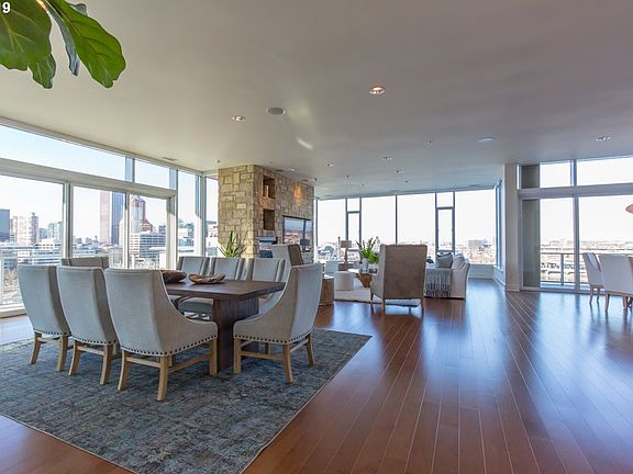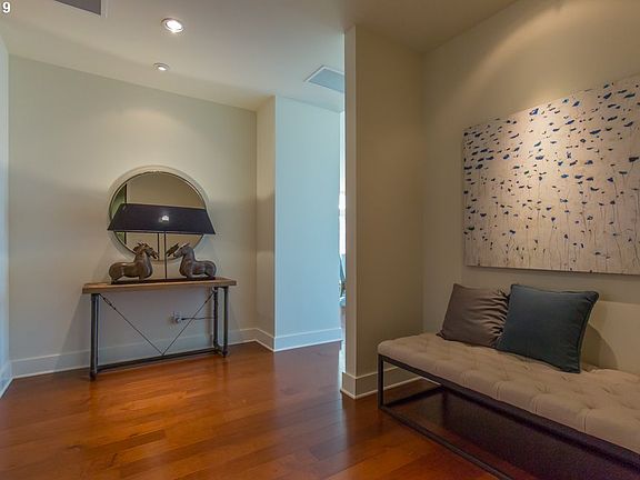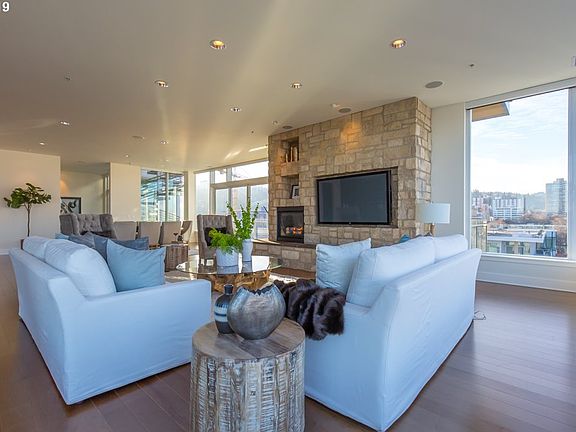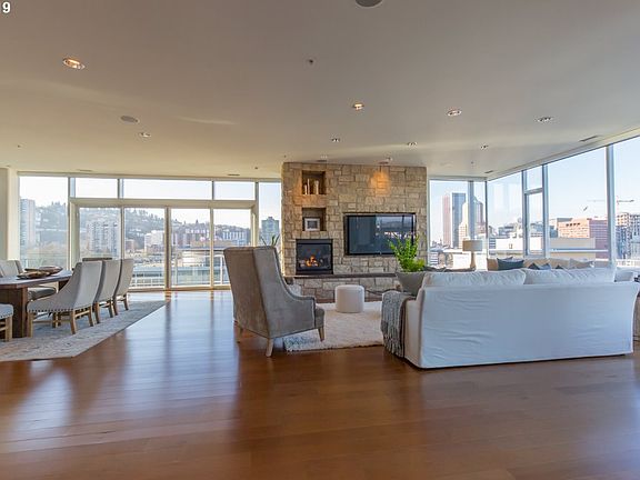 Breathtaking, luxurious penthouse perched over the Willamette River! Relish the vibrant views of downtown Portland and river activities, along w/ outrageous sunsets over Mt. St Helen, Rainier & Hood! The wide open floor plan is optimal for entertaining with 10 ft ceilings that flow onto the patio and spiral staircase leading to a private rooftop deck. It contains modern flair with a stone fireplace & unusual 5" wood plank hrdwd flrs.