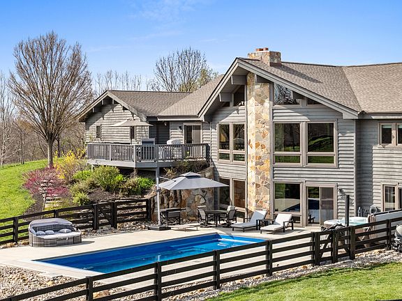 Welcome to truly elevated equine lifestyle living. Who says you have to sacrifice luxury for lifestyle? The home is a showstopper. Recently painted inside and out and a new roof. Cedar siding, new windows throughout the whole home. Take a moment to take in all the magic of the farm relaxing by the floor to ceiling picture windows. Summer is for relaxing by the new SW pool after a hard ride in one of the arenas or a hack down the winding trails. With a modern luxury cabin feel you will question whether you have escaped Outwest to the Yellowstone set. Entertaining family is a breeze with the open custom kitchen and finished basement the walks out to the pool deck. The new barn just finished in '23 has 11 12x12 stalls with dutch doors, hay loft, H/C washrack, boarders tack, private owner tack, bathroom, feed, and eq.room. Second barn has 9 stalls, 2 that walkout to the drylot, tack with W/D hookup, H/C washrack, feed. Slide the windows open on the indoor for a breezy covered pen feel. Ride outside in the beautiful outdoor under industrial lighting. The multiple paddocks have run-in sheds and autowater. 8 acres of hayfields. Along with a large hay and eq. barn.