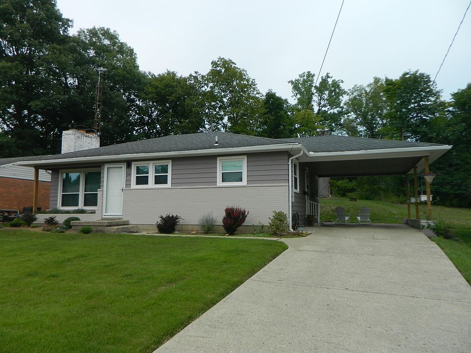 Adorable 2 bedroom home with 1 bath which has a tub/shower - ready for your move. There are hardwood and laminate floors throughout, faux wood blinds and curtains will stay with the home. The spacious living room has a decorative fireplace. Well maintained home with newer furnace and ac (2022) new hot water tank 2024, new vinyl windows 2022, roof is 30 year dimensional 10-12 years old. Full unfinished basement could be finished for additional living space. Newer landscaping. Carport has hanging planters which will stay with the home. Kitchen has butcher block counters and appliances will stay with home. All ceiling fixtures have been replaced and the dining room table and chairs will stay with the home. Both bedrooms have double closets. Exterior is cedar and brick. Very clean home and easy to show.