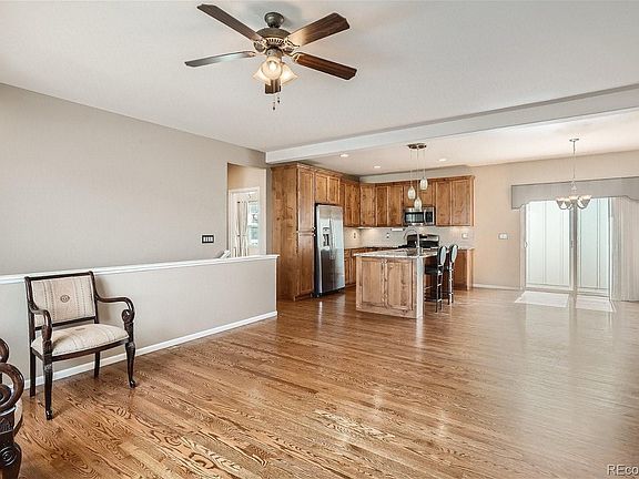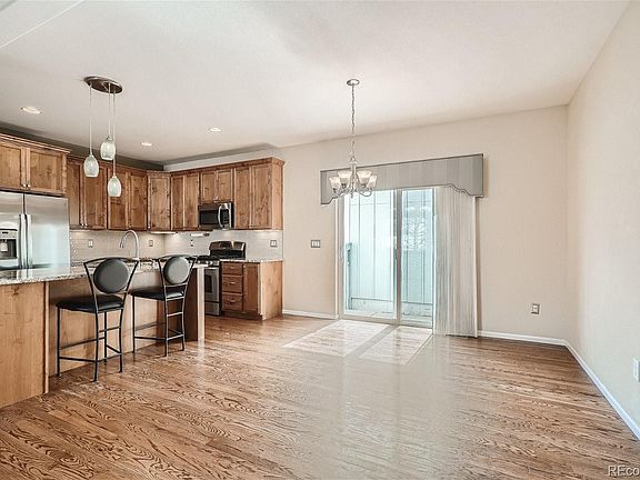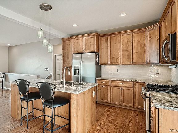 Beautiful move-in ready patio home ranch located in Latitude at Vista Ridge, with a main floor living layout featuring sparkling hardwood floors and an open living design, dining room, and kitchen that opens to a fenced private patio. The kitchen is equipped with all NEW granite counters, hardware, faucet, sink, tile backsplash, and stainless steel frig. A gas oven/range, a dishwasher, a microwave, and rich 42" Alder cabinets complete the lovely updated kitchen. The main floor's primary bedroom also features hardwood floors, a walk-in closet, and an adjoining private bathroom with separate dual vanities also, with new granite, sinks, and faucets. The lower level of the home has a huge (22x28) family room with wall-to-wall carpet, a wet bar, a wine cooler, natural cherry-finished Kraft-made cabinets, and a tile backsplash. The garage is a must-see and has two floor-to-ceiling walls full of cabinetry that offers a huge amount of extra storage. The home is conveniently close to various amenities and such as shopping & Children's Hosp., Colorado National Golf Club, Zen Garden, Monkey Park, Columbine Mine Park. The HOA includes access to two pools, hot tub, tennis & pickleball courts, walking trails, a fitness center, and monthly organized activities at the clubhouse. Close to Black Rock Elementary School and Easy access to I25. The front porch offers stunning views of the snow-capped mountains. The home is well-built, efficient, and insulated, resulting in low energy bills. Xcel gas $60mo., United Power elec. $60/mo., Town of Erie Water & Sewer $61/mo., blazing Comcast 235 Mbps $58/mo.