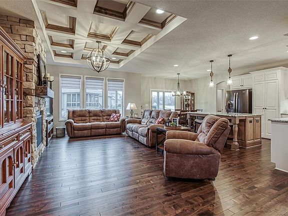 This BEAUTIFUL home is a MUST SEE!! You'll love the open floor plan for entertaining! The kitchen and living room design features hardwood floors, beautiful coffered ceilings, luxury light fixtures, and a floor to ceiling stone fireplace. Kitchen offers granite island and countertops, under cabinet lighting, lower pull-out shelves, and walk-in pantry with coffee bar. Office with pocket door located near the kitchen. Master bedroom ensuite is on the opposite side from secondary bedrooms and features granite, dual sink vanity, and walk-in shower with pebble rock flooring and accents. Huge Master closet with easy access to Laundry. Two additional bedrooms and full bathroom with granite, dual sink vanity, and decorative shower tile! Custom blinds, barnwood door, and comfort toilets are just some of the upgraded features this home has! Let's talk outside!! Corner lot with beautiful stone front, river rock landscaping, in-ground sprinkler system, and extended 3rd car driveway! Large backyard with covered patio for entertaining! Great neighborhood with pool, playground, pond, walking trail, and neighborhood activities throughout the year!