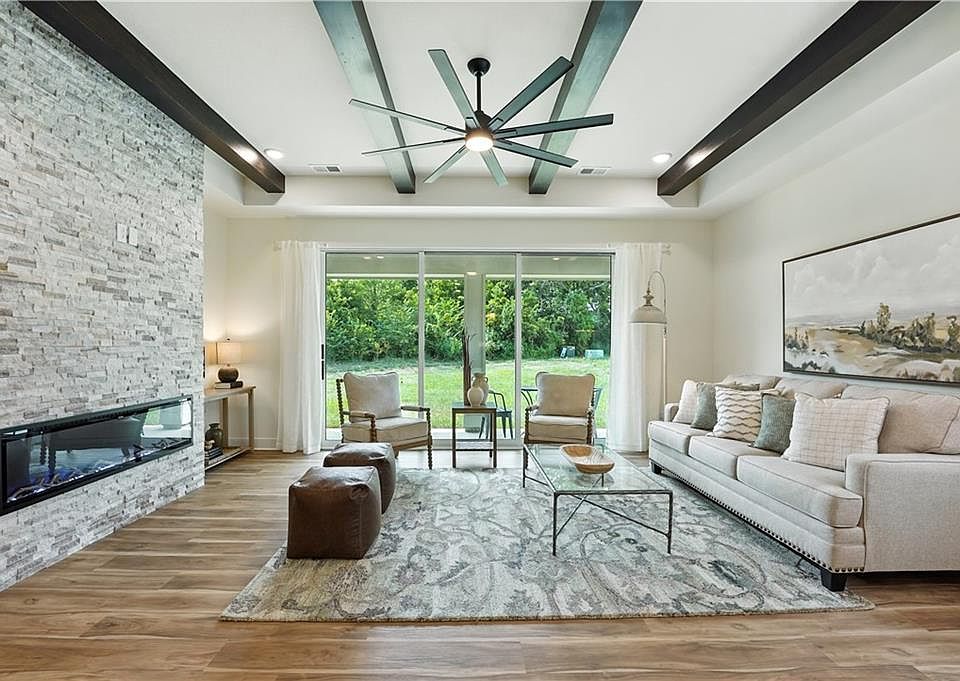 Floor-to-ceiling fireplacePrimary suiteCharming covered patioSleek quartz countertopsGreat roomGourmet kitchenSpa-like bath