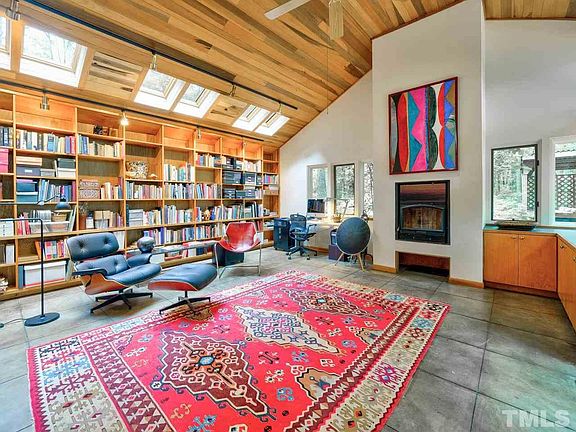 Light-filled, Danish/Modern passive solar home on 2 wooded acres brings nature indoors. Stunning office/library addition by Warner Hausler of Design Spec features cathedral ceiling, skylights, fireplace & built-in bookshelves. Main floor features white oak wood floors & cathedral ceiling, guest bedroom, full bath, solarium, renovated kitchen, living room w/fireplace, dining room & three decks. 2nd floor with master bedroom suite, loft office, bonus room, & laundry room. Crawl space fully encapsulated.