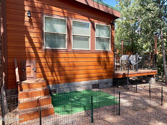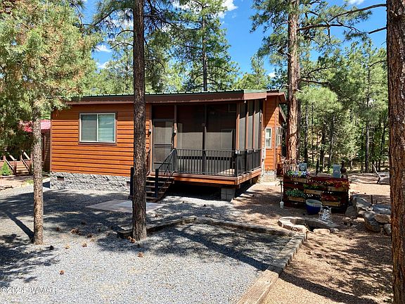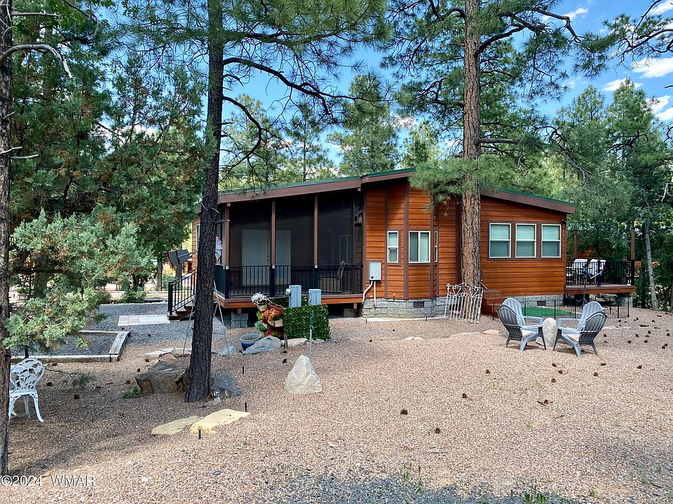 Do you like the park model concept but wish for more space? Properties like this are truly RARE! This home is one of the largest park models & sits on one of the BEST lots & includes the neighboring parcel, both of which border a large greenbelt w/ a seasonal spring & tall pines. The home offers 1,025 sq. ft. with both an Arizona room plus a separate 3 season room. Upon entry, you'll take in the large AZ room with gorgeous fireplace & modern finishes. The kitchen hosts ample storage, upgraded stainless steel appliances, adequate prep space, & dining. Retreat or entertain in the XL 3 seasons room, which is fully enclosed with T&G for a more rustic touch, plus laundry hookups. Downstairs is a bedroom w/ large closet, adjacent to full bath w/ walk-in tiled shower & addl storage. Double loft provides ample space to tailor to fit your needs as hobby area, den, additional sleeping quarters or storage. Enjoy the cool mountain air from either the screened in deck or large back deck. Both parcels include an 8'x10' storage shed and there's additional storage in the paver finished crawlspace. This home checks off all the boxes! Make it yours today!