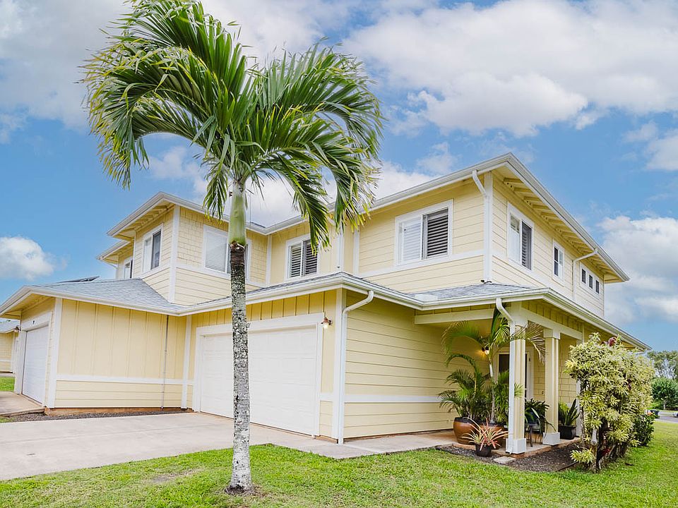 Upstairs, three bedrooms, two full baths, and a laundry area, offer added convenience. The primary suite is a retreat with a walk-in closet, split system air conditioning, and an ensuite with double vanities. The two additional bedrooms offer bright and airy spaces with views of the majestic Hau`pu mountain range. The home also features an enclosed, large 2-car garage with direct access to the kitchen.