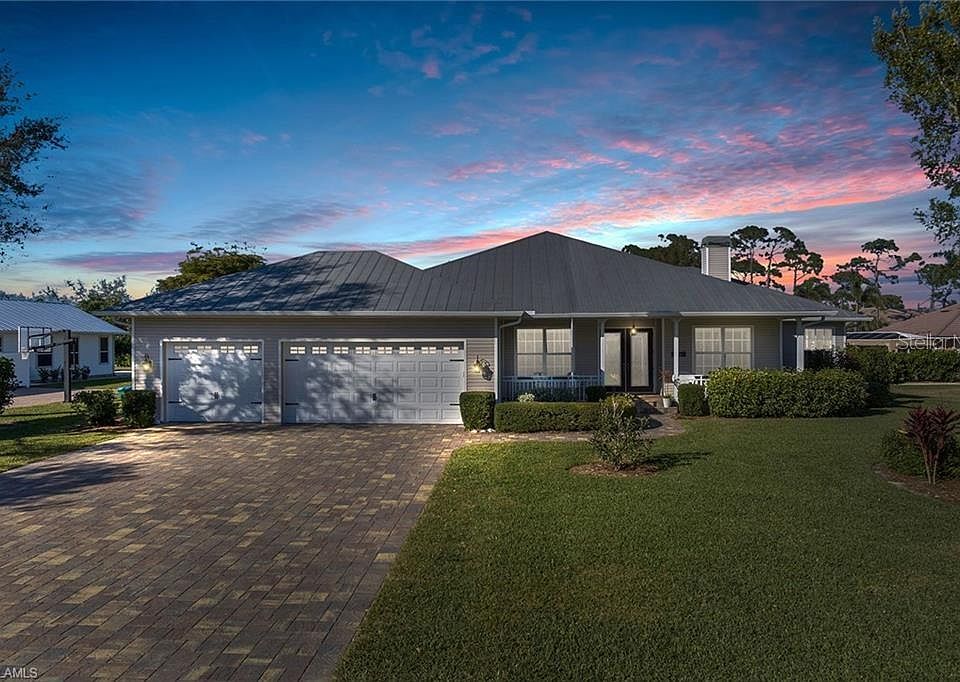 Dramatic Price Improvement! Old Florida Charm! Trafalgar Woods is a quiet and hidden gem! This luxury custom gated community comprising 49 homes on estate-sized lots features mature tropical and picturesque landscape and lakes. Upgrades include brand new metal roof installed March 2024!! No Flood zone! Plantation shutters throughout, custom driveway with pavers and parking for 14 cars. Newer custom pool with large lanai, waterfall and panoramic screen. This exquisite 2,445-square-foot residence on .7 acres, occupied by original owners, is a four-bedroom, two-bath home offering spacious accommodations for comfortable living. A focal point of this property is the inviting custom pool, showcasing the land with backyard fire pit. The pool area is the ideal setting for relaxation and entertaining amid the Florida sunshine. Enhancing the charm of the home is a front porch reminiscent of Old Florida architecture, ideal for enjoying serene views and gentle breezes. Additionally, the property features separate spaces for a home office and a den, providing versatility and convenience for today's homeowner. Property is walking distance to elementary, middle school and church and walking distance to Surfside Shops. This is a must-see!!!