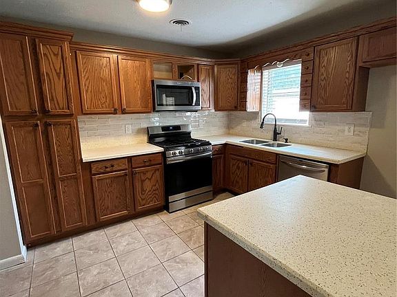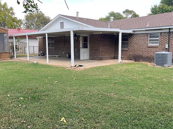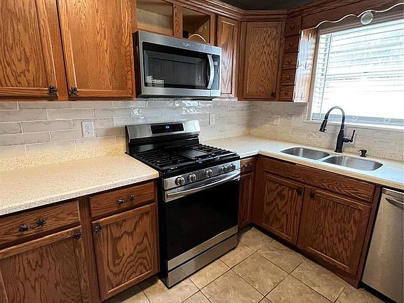 Totally remodeled and ready to move in, this beautiful three-bedroom, two-bedroom brick home is in a great family neighborhood. The foyer opens into a spacious living room which flows into the kitchen which has great ceramic flooring, lots of oak cabinetry, an island perfect for breakfast or feeding the children, new stainless appliances including a gas range with microwave/vent hood above it. The kitchen is open to a roomy dining area and connects to a great family room with a corner fireplace. There are three bedrooms, a hall bathroom with new double vanity and tiled shower/tub. The primary suite includes a large closet and a private bathroom. Outside there is a big, covered patio and an outbuilding suitable for an office, workshop or tanning bed space. This one will not last long! Call to schedule your showing today.