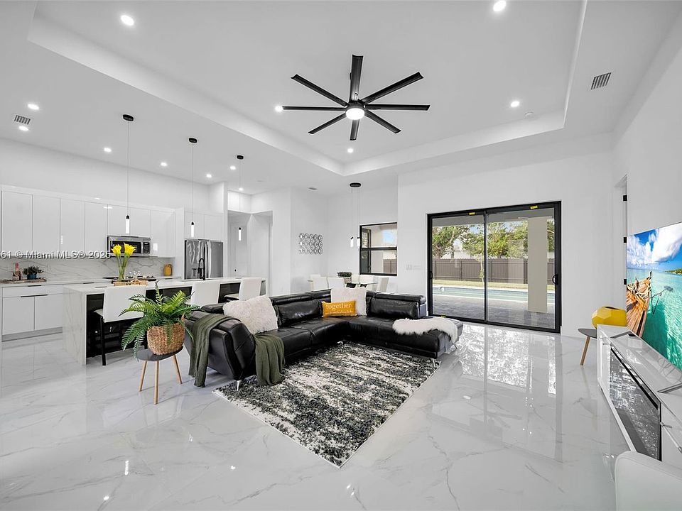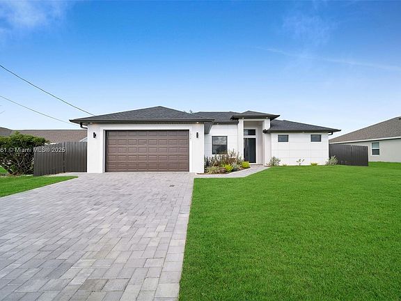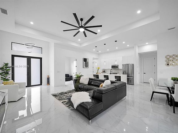 Experience modern Florida living in this 2024 new construction 4-bedroom, 2-bath home. The primary suite features dual walk-in closets and a tiled stand-up shower, while the second bath has backyard access. Enjoy a private saltwater pool with new heater. Porcelain tile flooring flows throughout, complemented by a 2-car garage, 4-car driveway, and storm-impact windows and doors. The chef’s kitchen boasts a Calacatta Quartz waterfall island, high-end appliances, and pop-up wireless charging. LED lighting, ceiling fans, and a dramatic living room fan enhance comfort. Step onto the lanai with a fully equipped outdoor Florida kitchen and lush landscaping with sprinkler system—luxury, style, and function all in one.