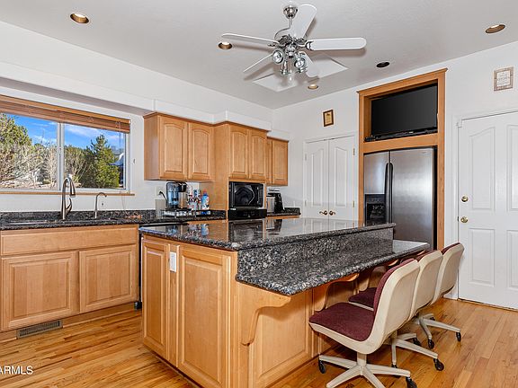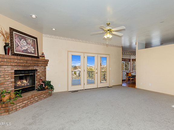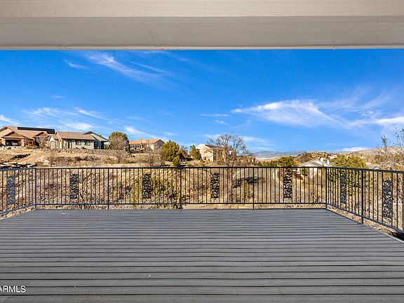 Beautiful brick sided home with awesome views! The main level contains the owner's suite, a 2nd bedroom and bathroom, living and dining rooms, custom chef's kitchen and 2 car garage. Kitchen has 3 ovens, 4 pantries, granite counters and plenty of space to prepare meals for large family gatherings. You can enjoy the views sitting by the fireplace or enjoy them outdoors on the main level deck off of the living room. Walk downstairs where you'll find two more common areas, 4 bedrooms, 2 bathrooms, a kitchenette and covered patio with fenced yard...perfect for multi-generational living. The home has laundry hookups on both levels, owned solar, new carpeting upstairs new composite decking. Nice value and location on the corner of a cul-de-sac in a desirable area of Prescott.