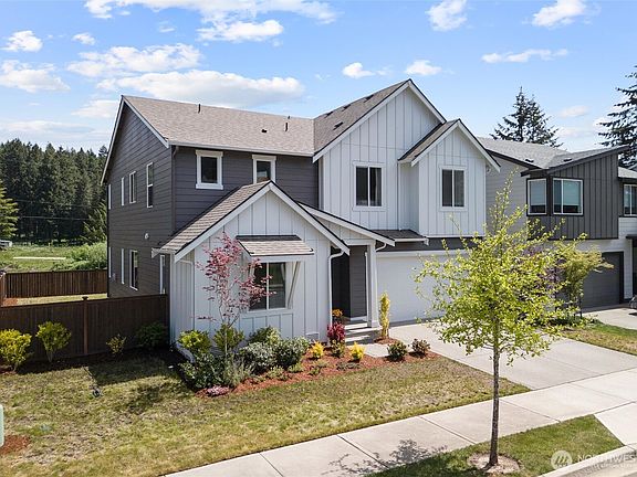 Beautiful home in picturesque Poulsbo Meadows! Many builder upgrades in 2021; custom millwork added since. Largest floorplan in the neighborhood: 5Bed/2.75Bath, main floor guest bedroom, downstairs den, great room, gourmet kitchen layout and pantry, upstairs laundry w/sink, generous loft and covered patio overlooking open green space. Home flooded in natural light all day. Upgraded gas fireplace w/ blower & floating mantel. Kitchen has quartz counters, pendant lighting, large island, gas range, SS appliances, Bellmont cabinets and upgraded wood pantry shelving. Open stairway features modern horizontal metal railing. Primary suite w/ two-vanities, two walk-in closets & custom wood paneling. 50-amp EV outlet! Close to schools.