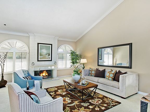 Welcome to a newly decorated home that lives like a single story with an added upstairs huge bonus room and bath with views of nearby hills, trees and lush landscaping. Awash with natural light from an abundance of vaulted ceilings, windows and skylights, this is a perfect place to call home. Inviting curb appeal boasts freshly painted exteriors, rich stone accents and lush landscaping. The expanded entry foyer enjoys two story ceilings and opens onto a private atrium with a hot tub. An added fireplace warms the family room which includes counter seating opening to the expanded kitchen. Custom designed, the kitchen includes a center island, built-in refrigerator, large pantry, breakfast nook with built-in window seat, crisp white cabinetry and Corian counters. Additional interior highlights include a fireplace in the living room, newly refinished wood flooring, plush carpeting, custom wood ceilings in the kitchen and family room. Enjoy complete privac y in the rear patio. No Mello Roos.