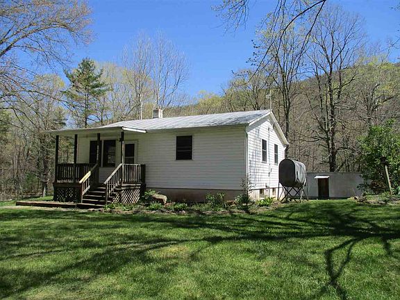 Come enjoy the peace and quiet as you listen to the soothing sounds of the mountain stream that runs in back of the property. Bordering National Forest, this 5.8 acres is improved with a 2 BR, 1 BA vinyl sided home with an unfinished basement. The home needs some TLC but makes a great weekend getaway or full time residence. A freshly tilled garden/flowerbeds all have topsoil added. Lots of maple trees that sellers tapped for maple syrup! Storage trailer has a PTO tractor generator. An additional storage building has a root cellar with concrete floor. Owners mostly used woodstove for heating and cleaned chimney 4-5 times a year, but there is also an oil furnace. In flood zone so requires flood ins. Owners used satellite for internet.