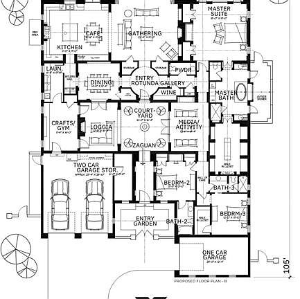 Resort-style poolGated courtyardAiry interiorsThree-car split garageThree bedroomsBroad loggiasMedia room