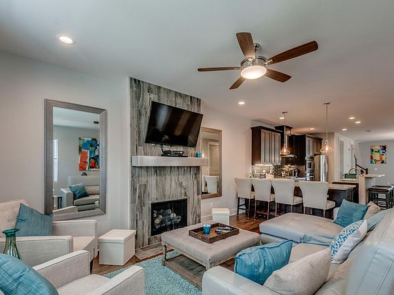 - Living room with sectional, chaise, ottoman, mid-century recliners, 50" Smart TV, and gas fireplace
