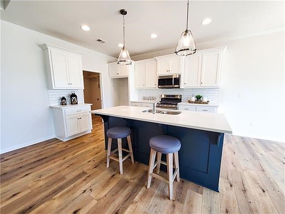 Beautiful ranch plan in Alexander Creek, Raymore's premier 55+ maintenance Provided community. Everything you need on one level & upgrades galore! This one has no steps going into the house from garage. Main areas have luxury engineered flooring. Quartz counters in kitchen and both bathrooms. Kitchen has stainless appliances with gas stove/range, great custom cabinets, plenty of counter space, and large pantry. Great room has fireplace with upgraded tile surround. Master suite has large bedroom & bathroom with double vanity, custom tiled shower, tub, and large walk-in closet.