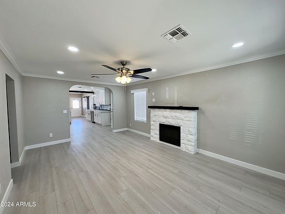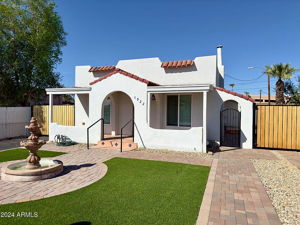 This fully renovated 1925 classic home blends charm with modern luxury. Featuring stunning luxury laminate floors and brand-new windows, the open floor plan is enhanced by beautiful wood beams and elegant crown molding. The custom bathroom showcases period-specific tile choices, while the kitchen boasts white shaker cabinets, quartz countertops, a striking blue tile backsplash, a pot filler above the gas range, and a farmhouse sink. Stainless steel appliances complete the space. Plus, enjoy peace of mind with a new roof and serviced A/C—all part of a permitted remodel!