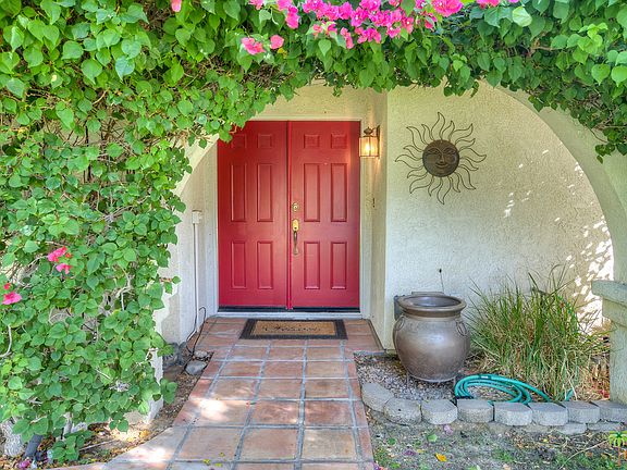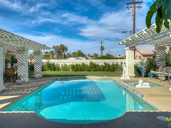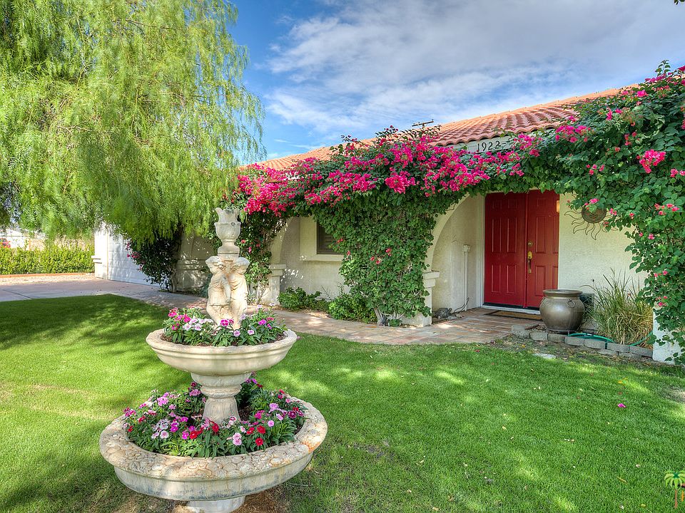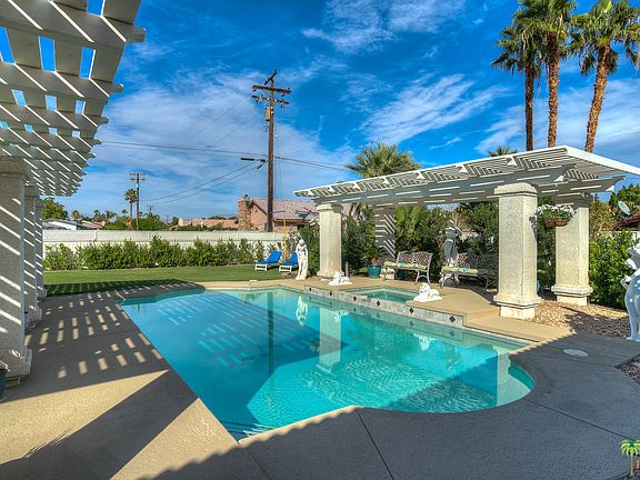 Palm Springs home with complete guest house featuring a Spanish Revival flair. Spacious open floor plan invites outdoors... in! Distressed Spanish tile floors, and stone fireplace set the tone for "Old Hollywood". Generous back yard & covered patio featuring bar area, overlooking "Neptune Pool" where you can relax and enjoy the mountain views. 4 bedrooms/3 baths, which includes a large guest house, is perfect for guests, or a "business" opportunity. The two car finished garage has an epoxied floor, and its own heat and AC unit. Perfect for a car enthusiast! To top it all off, the home has solar, with transferable lease, installed in 2015. This home has so much to offer, style, space and a welcoming sense of fun! VIEWS! VIEWS! VIEWS!
