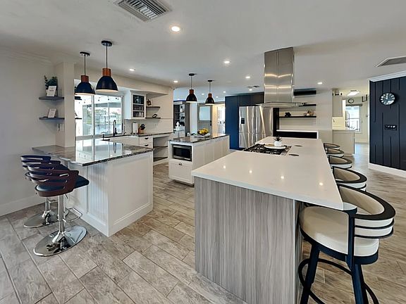Welcome to the Nauti Mermaid, your exquisite getaway in the heart of Cape Coral, FL. This luxurious three-bedroom, two-bathroom vacation rental is a true gem, offering upscale comfort and a host of amenities for up to six guests. From the moment you arrive, the charm of the Nauti Mermaid is undeniable. Located in a highly desirable neighborhood, the home features captivating canal views that set the scene for your stay. Step inside and you'll be welcomed by a refined interior, designed with relaxation in mind. The living room boasts stylish furnishings, a plush sectional, and a large smart TV ideal for game days or unwinding after a day on the water. A sliding glass door opens to the patio and pool area, creating a seamless indoor-outdoor living experience. A second living space provides additional seating and another smart TV, so everyone can enjoy their own downtime. The open floor plan makes it easy to stay connected, whether you're lounging, cooking, or entertaining. The kitchen is a dream for culinary enthusiasts, offering a central island, breakfast bar, and a full suite of appliances including a stove, oven, microwave, fridge, toaster, and a coffee and tea bar. A window above the sink offers lovely views of the patio while you prep meals. Just off the kitchen, you'll find a butler's pantry and a convenient laundry area, adding ease and functionality to your stay. The primary bedroom is a peaceful retreat with a king-size bed, smart TV, and a dedicated work desk with dual monitors perfect for remote work or quick check-ins. The en-suite bathroom is spa-like, with dual sinks and a large walk-in shower. The second bedroom is perfect for kids, featuring two bunk beds (twin-over-twin and queen-over-twin), a desk, and a TV. The third bedroom offers a king-size bed and serene views of the water. The second bathroom mirrors the primary with dual vanities and a walk-in shower. Step outside and experience true Florida living. The patio offers an outdoor dining area, premium grill, lounge chairs, and a private pool overlooking the canal. As evening falls, gather around the fire pit and soak in the glow of another perfect day. There's parking for up to four vehicles in the driveway.