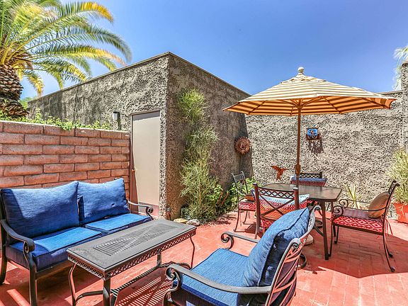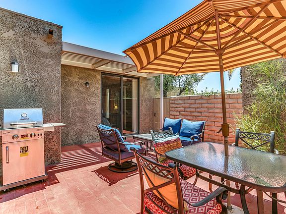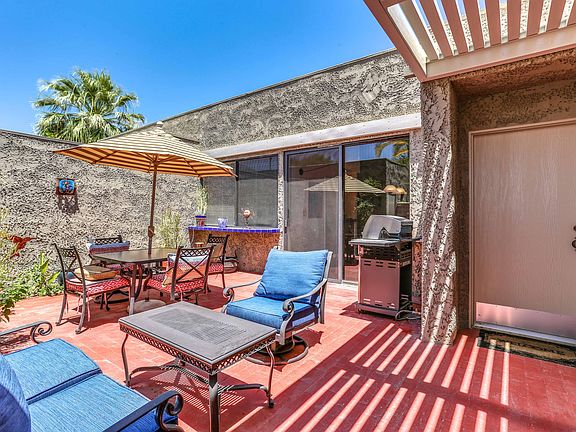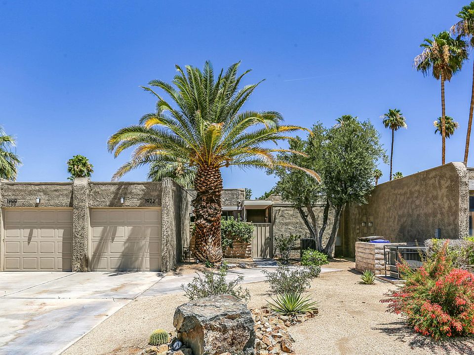Welcome to Sunrise Oasis Estates, a community of 96 contemporary residences surrounded by greenways with scenic walkways and views of the San Bernardino, San Jacinto and Santa Rosa mountain ranges. This two-bedroom, two bath condo features wooden beam vaulted ceilings in the living and dining areas, wood floors in the living, dining and bedroom areas as well as tile flooring in the bathrooms. The master bedroom includes an En Suite Bathroom. The bedrooms, living room and dining room all have sliders off to patios for outdoor enjoyment. The front Patio is enclosed and is great for outdoor dining and lounging. This property has a resort atmosphere with a southwestern theme. The property comes fully furnished. The single car detached garage is accessible from the front courtyard. The property is on land you own. Community amenities include three pools, three hot tubs and 2 tennis courts. Sunrise Oasis Estates is centrally located between Downtown Palm Springs and the Palm Springs International Airport. The condo is only a few blocks from Ruth Hardy Park and shopping is nearby.