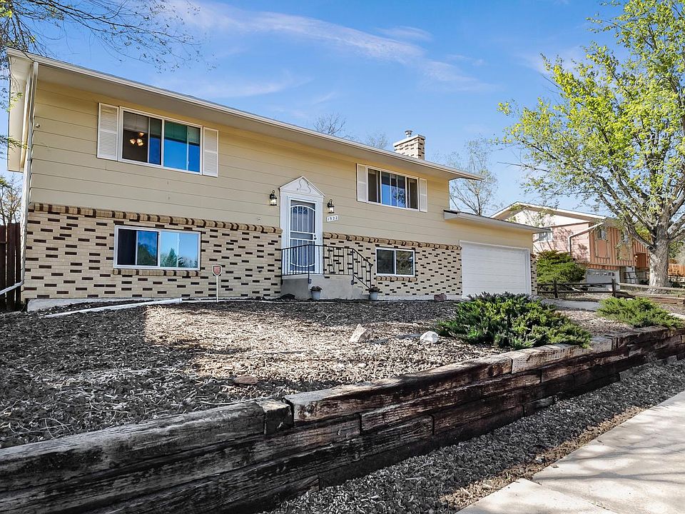 Walk out onto your Deck from Kitchen/Dinning area, that overlooks Large sloping backyard, incredible views of Pikes Peak and Cheyenne Mtn. Hiking trails are accessible from your backyard gate. Open kitchen, dinning, and living room. Master bedroom and additional bedroom on upper level as well as bathroom. Downstairs enjoy two more bedrooms, bathroom, large family room, with nook reading/exercise area and wood burning fireplace, plus a separate Laundry area. Lower level under stairs has a large storage area. Newer appliances in the kitchen 2017: Refrigerator, Range Oven, Dishwasher. The downstairs leads to the covered cement Patio area, and fenced yard. Walking distance to local Brewery or Church's. The two car Garage is insulated with built in cabinets. The roof was replaced with GAF system including new vents and gutters in 2018. In 2018 the covered patio was also replaced with a new metal covering. Shed in backyard stays. Washer and dryer stay.