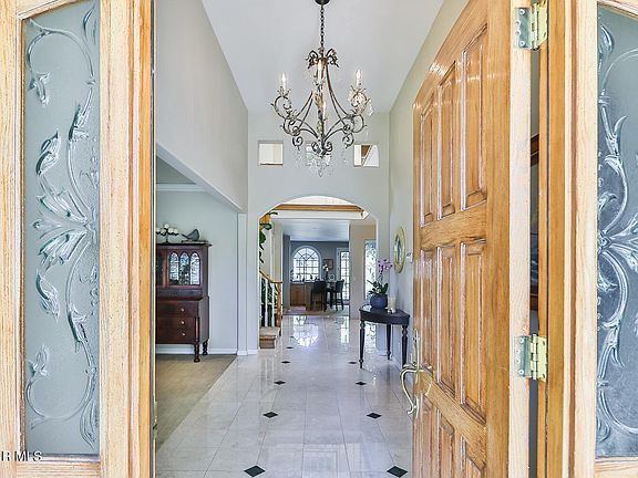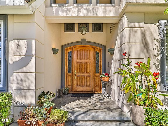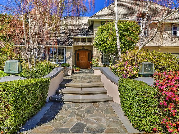 At last, the spectacular peaceful and serene location you've been waiting for in the prestigious Buckingham Estates! This breathtaking home is timeless in its style and curb appeal. Featuring over 5200 ft.² of living space (per assessor) and sitting on nearly half an acre, this home has it all! Elegance abounds as you are greeted with soaring ceilings and an elegant formal living room. Exquisitely adorned with white shutters and a warm and inviting fireplace, this room is captivating. A separate spacious formal dining room with beautiful French doors is another fabulous feature of this stunning estate. The chef's kitchen features a Sub Zero refrigerator, a Thermador oven with warming drawer, a Russell 6 burner stove and picturesque windows highlighting the light, bright and English garden feel of this dream home. The breakfast area and family room, including an entertainer's bar with a wine refrigerator have enchanting views of the lush and sprawling resort like backyard. The downstairs level also features a powder room, laundry room, and 2 en suite bedrooms. Currently, one bedroom is being used as a library/study and boasts elegant French doors, custom built-in bookcases and a lovely pool and garden view. The upstairs living space is grand. The primary bedroom is gorgeous with a scenic balcony overlooking the sprawling estate. The en suite bath is luxurious featuring separate cedar walk-in closets, a relaxing Jacuzzi tub and a steam shower. There are two additional en suite bedrooms upstairs with one being attached to a generous and versatile bonus/creativity room. The dramatic backyard showcases a sparkling beach entry pool and Jacuzzi, a Koi pond, lighted tennis court, built-in barbecue, TV and a bountiful vegetable garden. This home is Southern California living at its finest!
