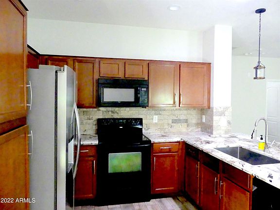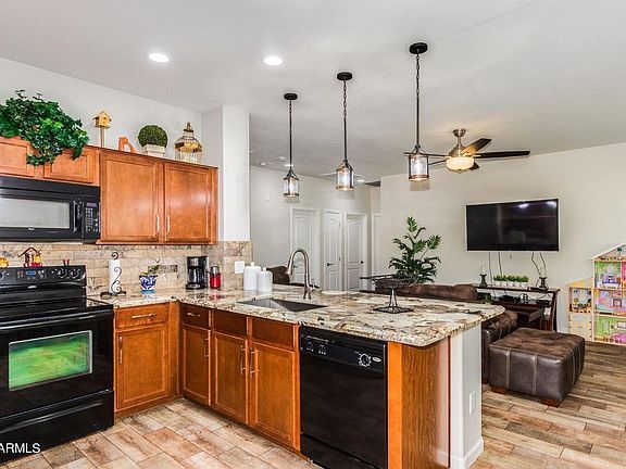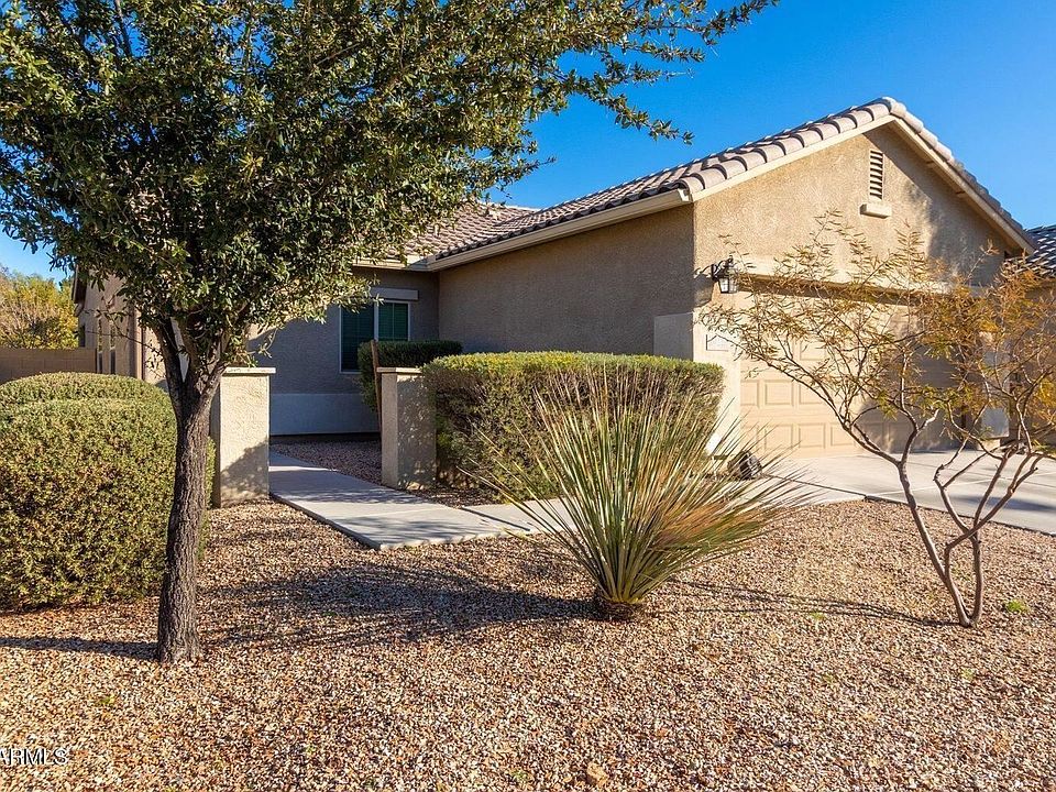 Sweet 3 bedroom 2 bath home in Vista Montana by D.R. Horton. This home has some beautiful upgrades. Gorgeous kitchen with stunning granite countertops, modern lighting, and a side by side stainless Samsung fridge. Beautiful neutral wood look tile throughout the home. No carpet! Ceiling fans throughout. Window coverings throughout Added storage in garage. Low maintenance landscaping. Leased solar system provides 6.5 KW of power $113/mo.! Buyer must transfer lease. The backyard has both a covered patio and ramada perfect for entertaining! Community park and childrens' play area just a stone's throw from the home. Close to I-10! Some photos show furnished home but home is currently not furnished.