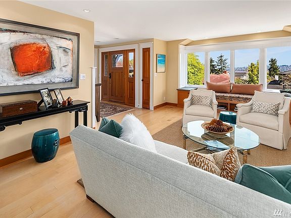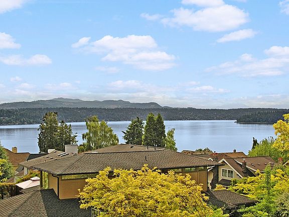 Shingled 3-level Craftsman with sweeping views of Lake Washington, Cascades and Mt. Rainier. Main level with flexible floor plan has access to view balcony and enclosed back yard with stone terrace. Great kitchen with stainless steel appliances and adjacent living and dining areas. Entire top level devoted to master suite with balcony. Lower level has rec room, bedroom, ¾ bath and access to attached garage. Charming detached studio/office in backyard. Nicely landscaped grounds in quiet location.
