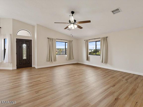 Perched on a hill in the sought-after Cliff Rose neighborhood, this single-level home captures sweeping views of the Bradshaw Mountains, distant ridgelines, and the iconic Thumb Butte. The exterior is finished in low-maintenance stucco with manicured landscaping, creating a polished first impression.Inside, the great room welcomes you with soaring vaulted ceilings and abundant natural light that frames the breathtaking scenery beyond. Fresh baseboards, recessed alcoves, decorative shelving, and updated ceiling fans add both function and charm, making the space feel open and inviting. The kitchen sits nearby with oak cabinetry, granite countertops, a gas range with convection oven, and a crisp white appliance suite. Just off the kitchen, the laundry room doubles as a mudroom with upper storage cabinets and hookups for either gas or electric dryers.The primary bedroom is a serene retreat with generous proportions, a sliding Arcadia door opening to the back patio, a walk-in closet, and an ensuite bath featuring dual sinks and a walk-in shower. Two guest bedrooms provide comfortable accommodations, each with ceiling fans, while updates throughout the home--including raised panel interior doors, oil-rubbed bronze hardware, comfort-height toilets, and wood laminate flooring--reflect thoughtful care and attention to detail. Freshly painted inside and out, the home also benefits from a new HVAC system and roof installed in 2022, along with updated appliances, modern fixtures, and a new kitchen sink, ensuring both style and peace of mind.The backyard offers a relaxingpatio where you can enjoy the panoramic views, plus a handy storage shed and direct access from the garage. A Wi-Fi-enabled garage door opener adds modern convenience, while a side access door to the yard enhances practicality. Move-in ready and meticulously maintained, this home blends comfort, updates, and location into one exceptional package.